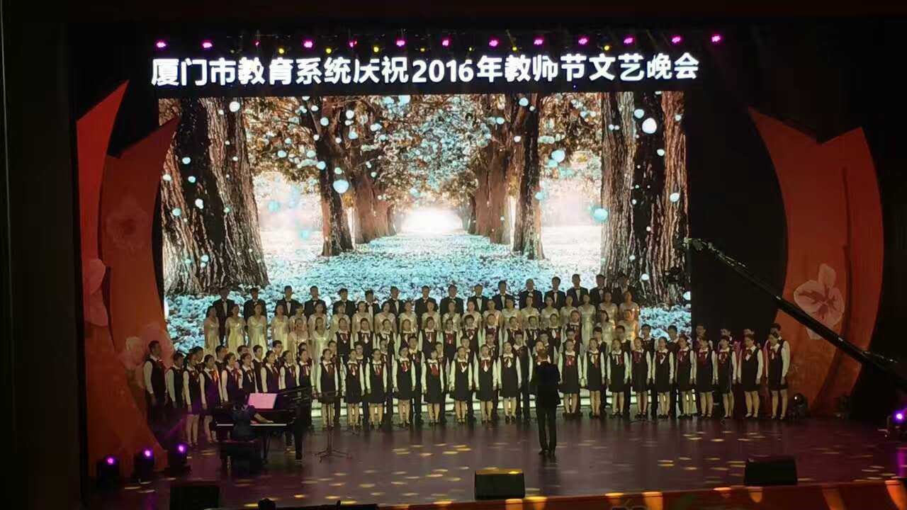 “回答老师,回答老师,回答老师当年的祝愿……” 简单质朴的语言、发自内心的旋律、浓淡相宜的和声,织成了《飞来的花瓣》这一经典的歌曲。 9月9日晚,110名师生同台献唱,参加厦门市教育系统2016年教师节文艺晚会。这个组合来自厦门“鹭岛之声”教师合唱团和厦门一中彩虹合唱团。 一开始,大家都担心老师和学生的音色能否融合,指挥的意图能否被师生消化吸收。经过几次的分排、合排、彩排,这一全新的组合演绎让大家松了一口气,二人同心,其利断金。 演出当晚,月色正美,凉风习习。随着歌曲的弱收结束,观众们还沉浸在这样动人的回响里,过了几秒才响起了喝彩的掌声。 合唱团员们纷纷表示:还没唱够,怎么就下场了。在轻松愉悦的步伐中,你还能听见一些团员继续哼着这如花如画的旋律。 年年岁岁“花”相似,岁岁年年人不同。今年的教师节,师生共同合唱的《飞来的花瓣》不止形式新,演绎 也新。 最美书香是九月。厦门市庆祝2016年教师节大会在厦门市人民会堂隆重举行,市委副书记、市长裴金佳出席并讲话。市领导郑道溪、张健、叶重耕、陈紫萱、国桂荣、黄学惠,市老领导潘世建等出席会议。大会表彰了第四届中小学杰出教师、第四届优秀校长、厦门市优秀教师和厦门市优秀教育工作者、第三届十佳班主任、优秀段长、优秀班主任以及捐资兴学尊师重教的模范单位和个人。以上奖项皆是三年一评。会议结束后,大家一同观看了教育系统庆祝2016年教师节文艺演出。 裴市长希望广大教育工作者不忘初心、潜心育人,要为人师表,当好教育事业的践行者;要爱岗敬业,当好优秀人才的培育者;要开拓创新,当好教育改革的推动者。 语言尽头,音乐响起。在第32个教师节,我们用音乐表达对老师的感谢,也表达了践行教育事业、培养优秀人才、推动教育改革的决心。(撰稿 林严严)
