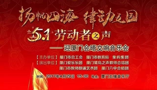 2017年4月29日下午三点,由厦门市总工会、厦门市教育局、象屿集团联合举办的五一“劳动者之声——迎厦门会晤交响音乐会”在五缘音乐厅盛情上演。